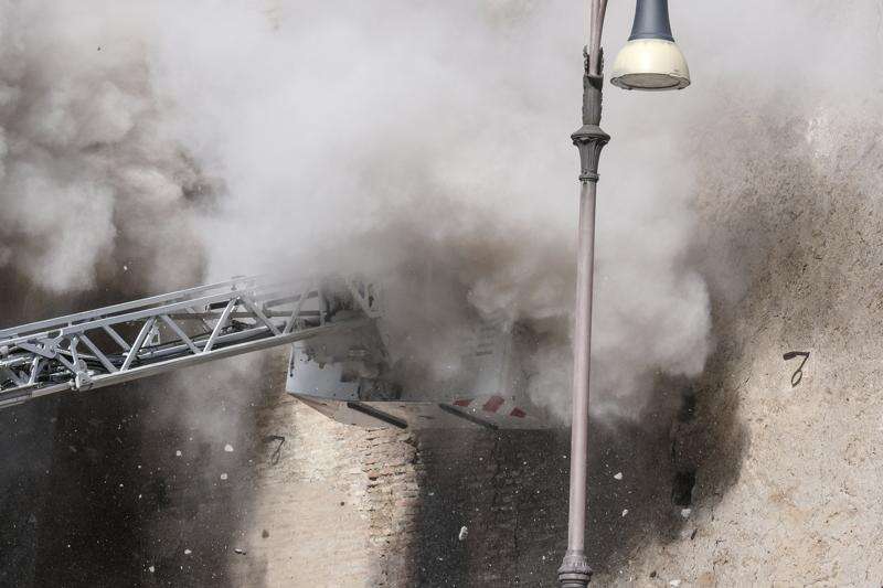 Hundreds of tourists had gathered to watch as firefighters used a mobile ladder to bring a stretcher to the upper level of the Torre dei Conti during the first rescue attempt. Suddenly, another part of the structure crumbled, sending up a cloud of debris and forcing firefighters to quickly descend on the ladder.