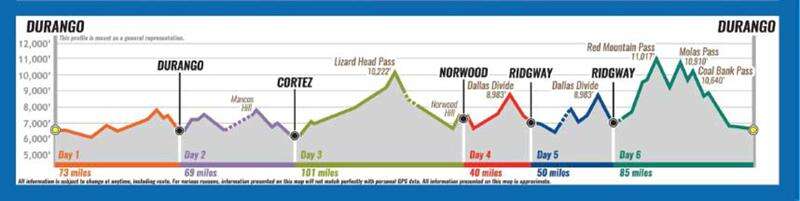 June 13 will see riders conquer a 73-mile loop that will start and end in Durango with a pass through Ignacio, Bayfield and Vallecito. The second day will travel from Durango to Cortez on some back roads, including a section of dirt roads. It totals 69 miles with the high point atop Mancos Hill before passing by the entrance of Mesa Verde National Park on the way to Cortez.