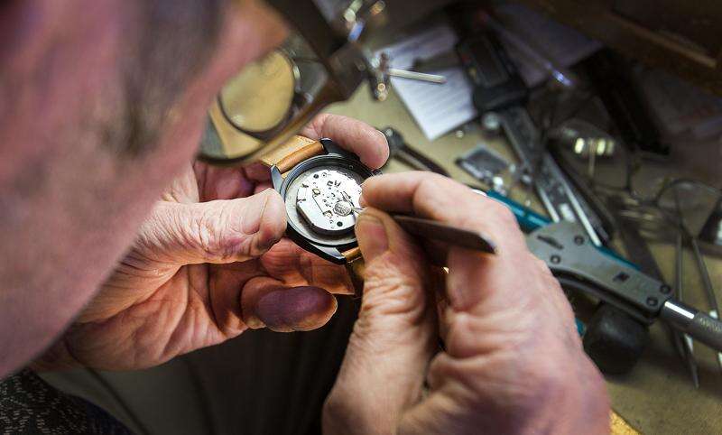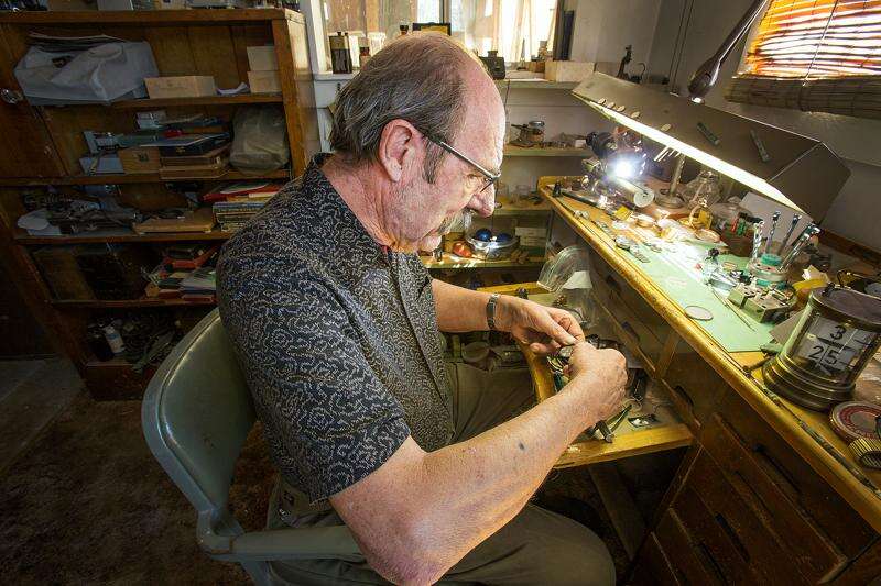 Robert Scott works on a wrist watch from within his shop on County Road 240. Photo by Shaun Stanley/DurangoHerald<br>