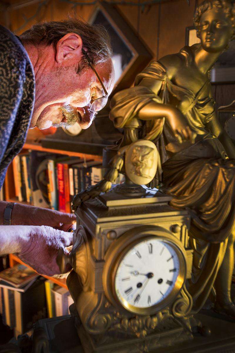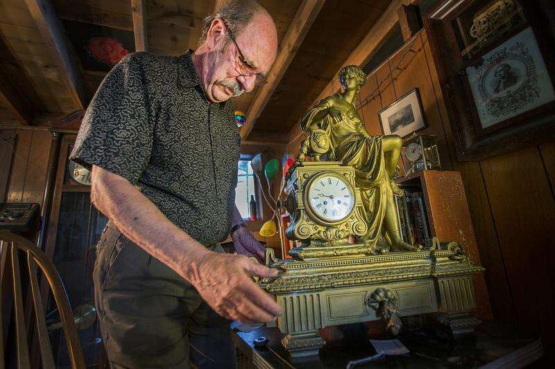Robert Scott works on an antique french clock from within his shop on County Road 240. Scott said he's not attached to his clocks, but he admires this one, which was made in 1830.