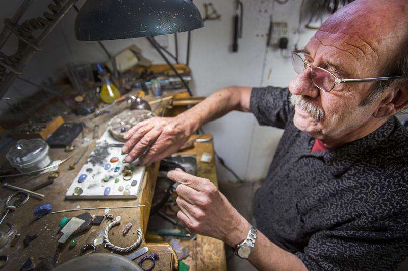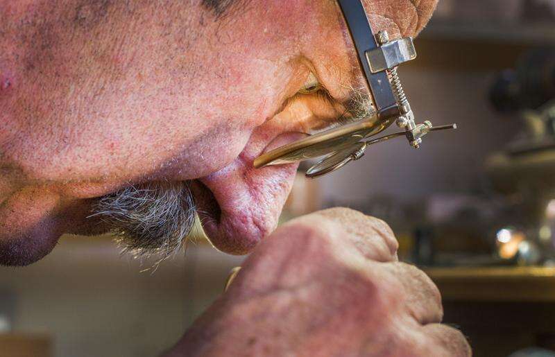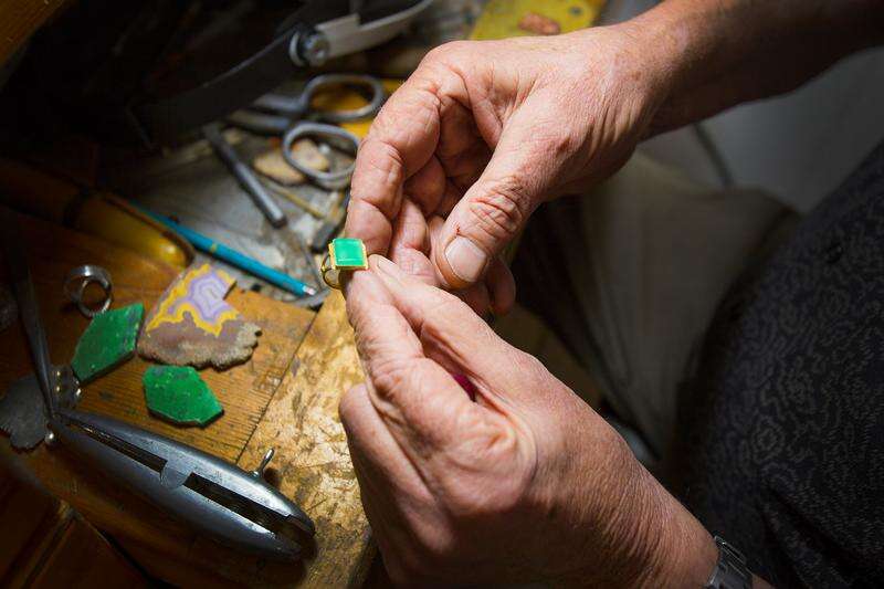 Robert Scott places a gem stone in a ring setting from within his jewelry and metal shop. Photo by Shaun Stanley/DurangoHerald<br>