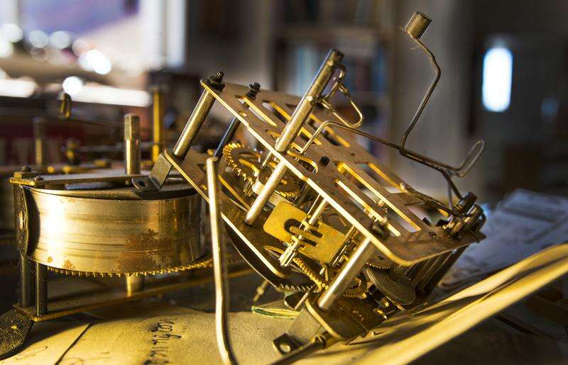 Finely machined inner parts of a clock lays on a counter in the repair shop of Robert Scott on County Road 240. Photo by Shaun Stanley/DurangoHerald<br>