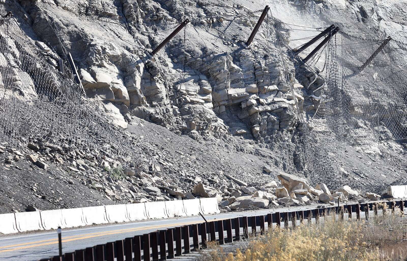 The retaining fence – constructed of heavy metal posts anchored into the slope supporting a burly metal curtain that catches falling rocks and directs them downward, behind a concrete barrier – had worked as designed.