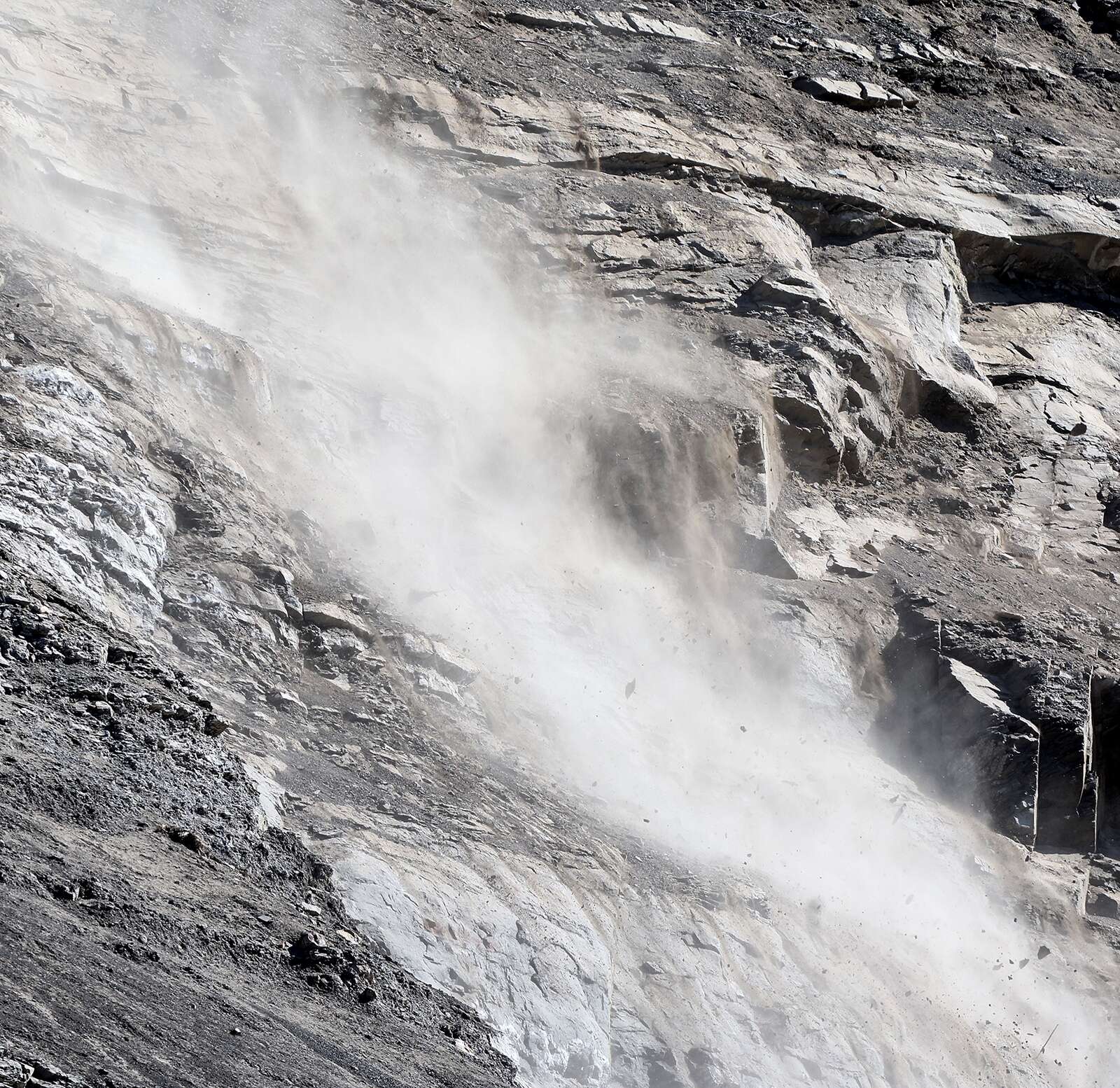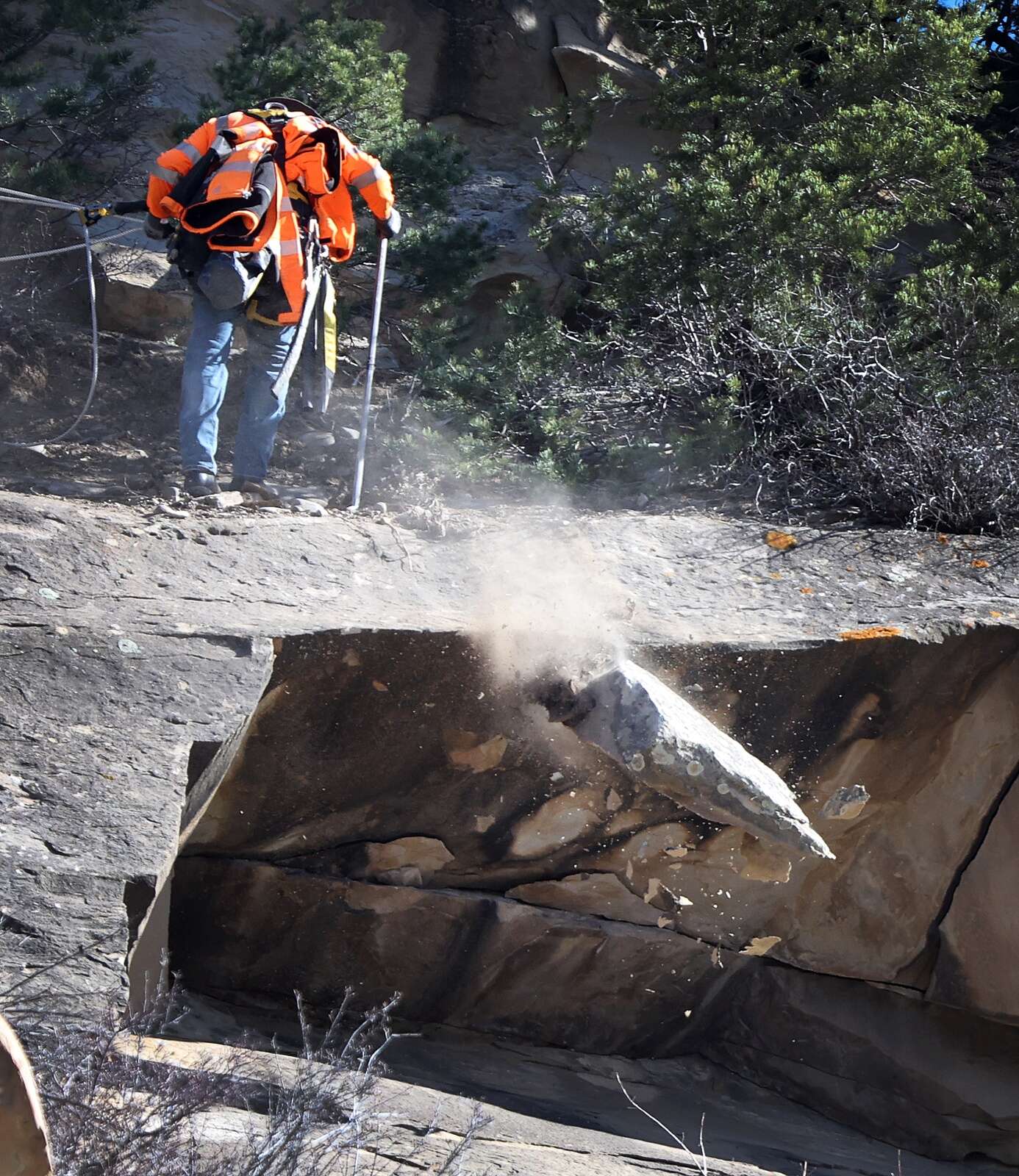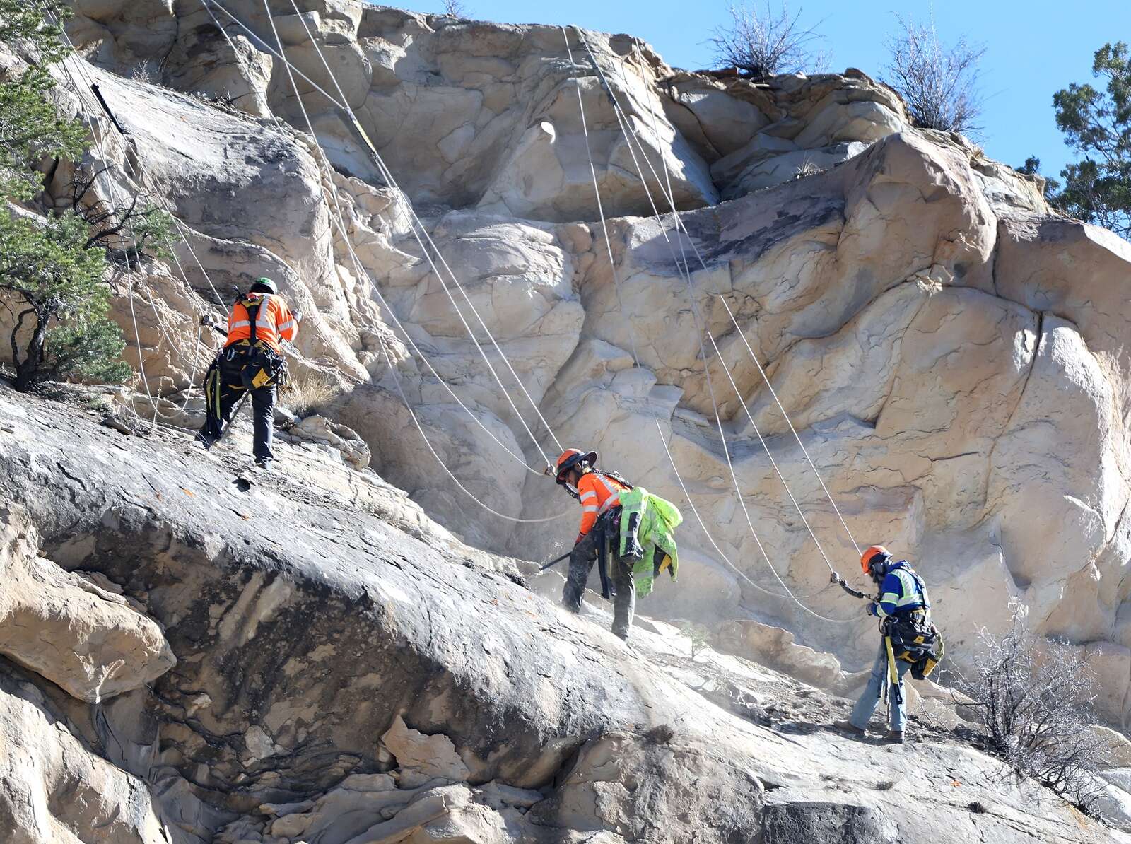 On Wednesday, workers tied themselves off with a two-rope rappel system to tree anchors and dangled themselves over the sandstone cliff looming above Highway 3. They worked methodically, using their feet, hands and big steel bars to jimmy loose rocks free and send them careening down the cliff face.
