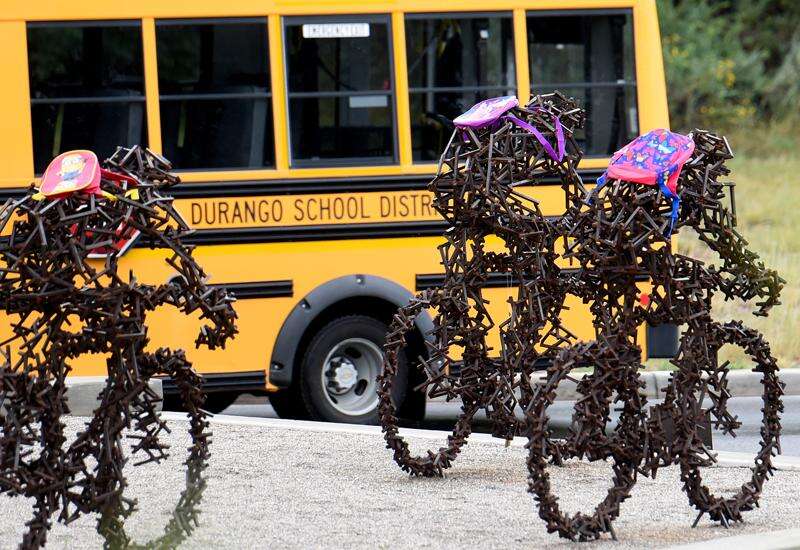 Figures in the “Endurance” sculpture in the roundabout at Florida Road and Riverview Drive sport backpacks Wednesday afternoon. Durangoans have enjoyed adorning the statues with seasonally appropriate garb – wearing everything from Speedos to Santa Claus hats.