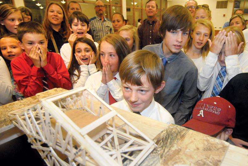 Mountain Middle School sixth-graders Hunter Gray, front, watches as his 38.3-gram bridge withstands the weight of 7.36 kilograms during a competition Tuesday evening at Fort Lewis College. Science teacher Josh Dalley said the event is the culmination of an eight-week project called Bridging the Gap. The project’s focus is teaching students about Newton’s laws. Hunter’s parents are Matthew and Leah Gray. Naima Van Tyn designed the bridge with Hunter and is not pictured. Naima’s parents are Jeroen Van Tyn and Anne Bartlett.