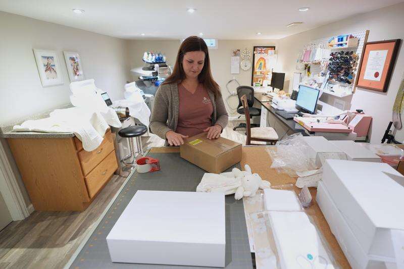 Sue Bacarro packages an order for shipping at her Etsy shop, Digi Wildflowers, Thursday, Oct. 30, 2025, in Windsor, Ontario, Canada. (AP Photo/Paul Sancya)