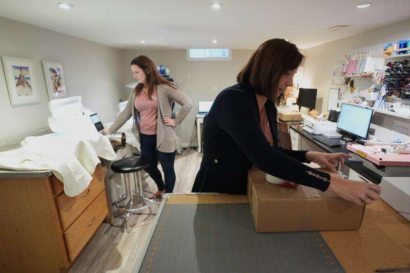 Fran Poirier, left, and her sister, Sue Bacarro, right, fill orders at their Etsy shop Digi Wildflowers, Thursday, Oct. 30, 2025, in Windsor, Ontario, Canada. (AP Photo/Paul Sancya)