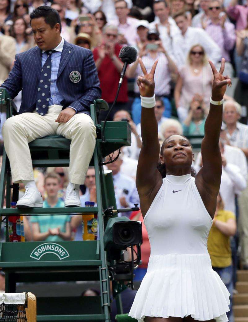 Williams lifted both arms overhead and raised two fingers on each hand right there on Centre Court to show off the magic number after winning her record-tying 22nd Grand Slam title by beating Angelique Kerber 7-5, 6-3 in the Wimbledon final on Saturday.