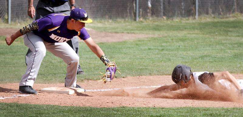 Lawrence Mayberry started a couple of strong defensive plays. After leaping to grab a line drive and firing a throw to first base to turn a double play to end the top of the first inning, he grabbed another well-hit liner to second base to start the triple play. After snagging the liner, Mayberry fired to second base to double off a Denver North runner who had strayed too far. Shortstop Casey Dunlap hauled in Mayberry’s throw and quickly turned to fire to first base, where Chris Jaworsky was waiting to tag his base to complete the triple play, as another Viking on first also had started to run on contact.