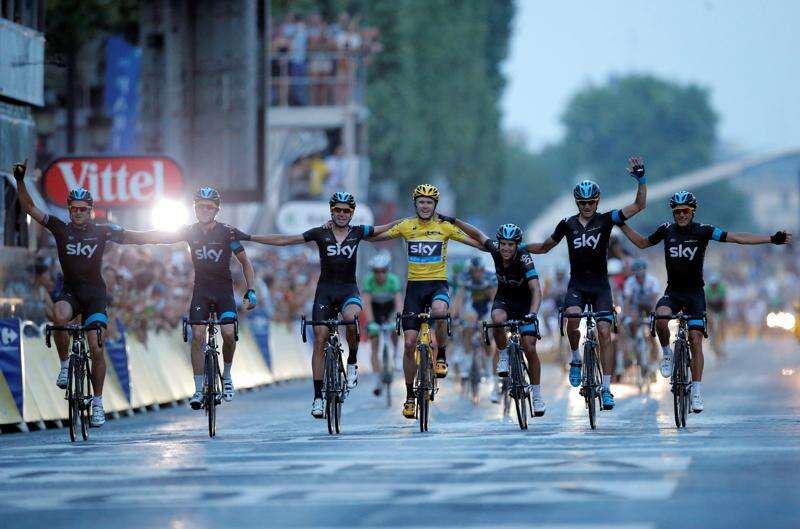 Froome rode into Paris in style – in the canary yellow race leader’s jersey he took on Stage 8 in the Pyrenees and never relinquished, vigorously fending off rivals whose concerted challenges turned this Tour into a thriller. Froome and his Sky teammates linked arms as they rode for the line.