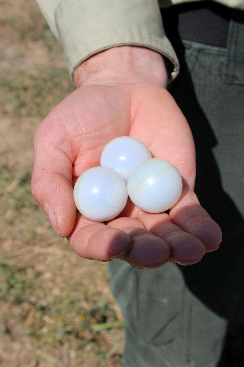A three-person crew in a small helicopter drops the spheres over the burn area through a plastic sphere dispenser. The white balls, which are a little smaller than a Ping Pong ball, contain potassium permanganate. The dispenser has three chutes which oscillate, dropping four balls at a time. Before they drop, a needle injects glycol, or antifreeze, into the spheres. An exothermic reaction between the substances starts ignition when the spheres hit the ground.