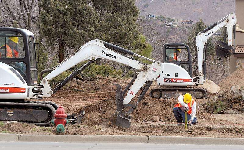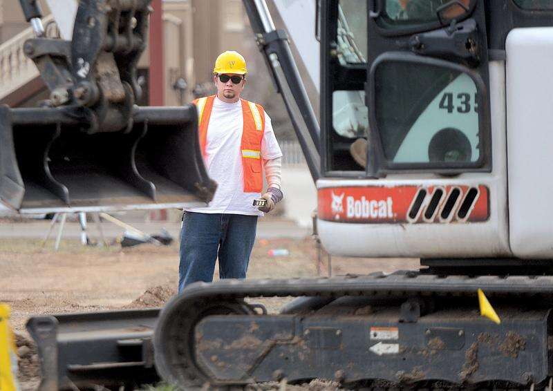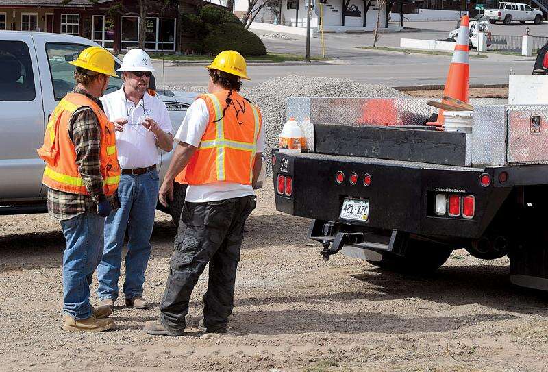 STEVE LEWIS/Durango Herald - DURANGO - 04/02/13 - Former Southwest Transitions resident John Olivas, front, and current resident Danny Armenta work for Animas Valley Construction on Tuesday afternoon on north Main Avenue.
