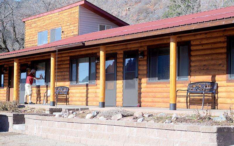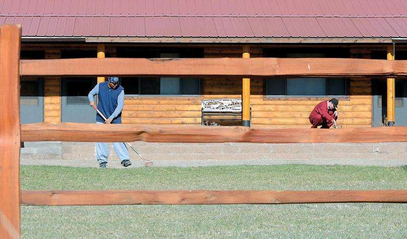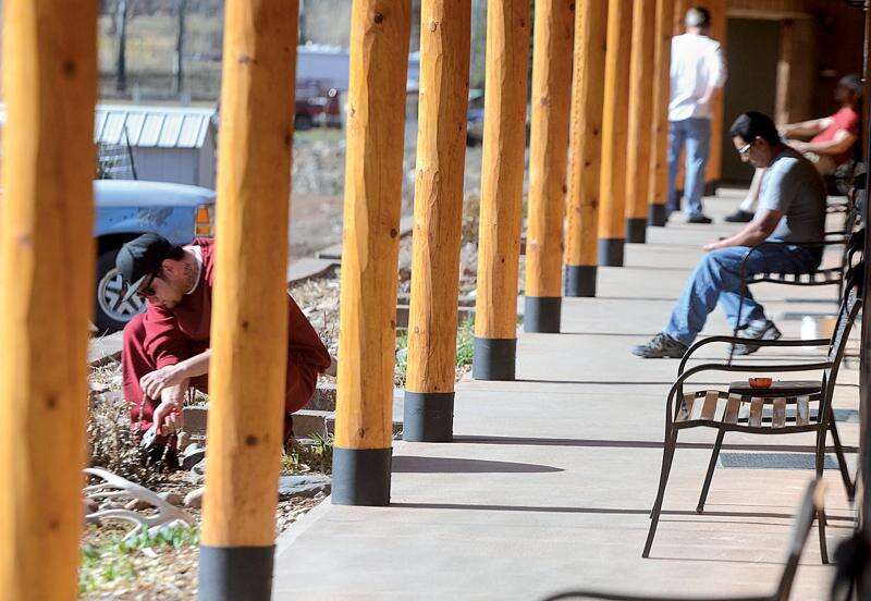 STEVE LEWIS/Durango Herald - DURANGO - 03/30/13 - Randy Hannum, resident manager at Southwest Transitions, said there are far fewer problems at the transitional house than there were with the motel that previously occupied the site. Residents Irvin Wilson, left, and Danny Armenta work on the grounds on Saturday morning.