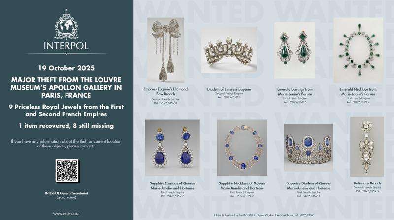 This photo provided Thursday Oct. 23, 2025 by Interpol and taken from its website shows the jewels stolen in the Louvre museum on Sunday Oct.19, 2025 in Paris. (Interpol via AP)