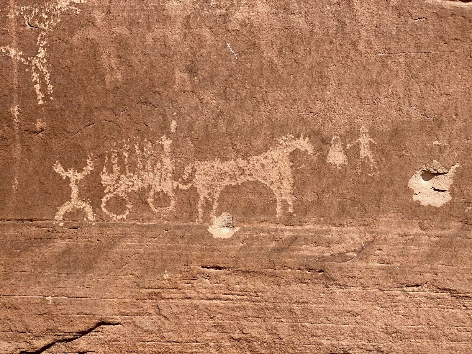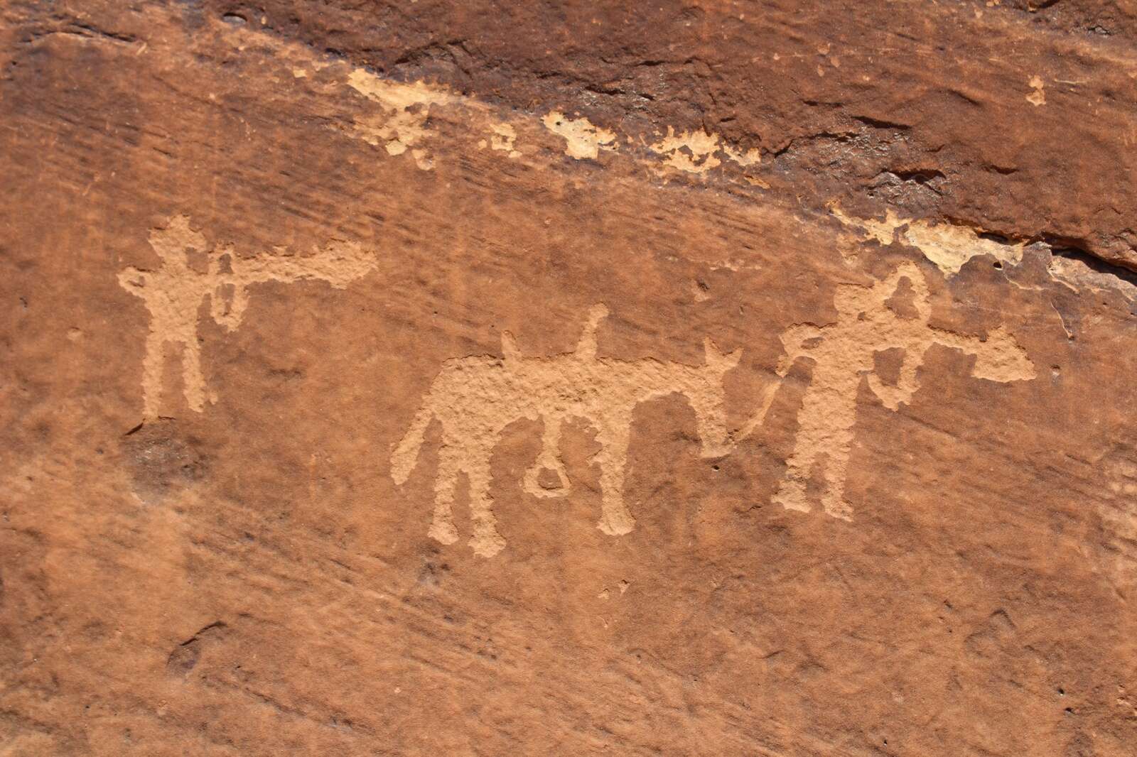 Those stories trace events as well as document newly arrived technologies in the 18th and 19th centuries as Spanish explorers and traders moved through the landscape bringing horses, saddles and weapons. Other glyphs show horses and wagons, probably representing Mormon settlers from the Church of Jesus Christ of Latter-Day Saints, settling in San Juan County, Utah, or San Juan County, New Mexico.