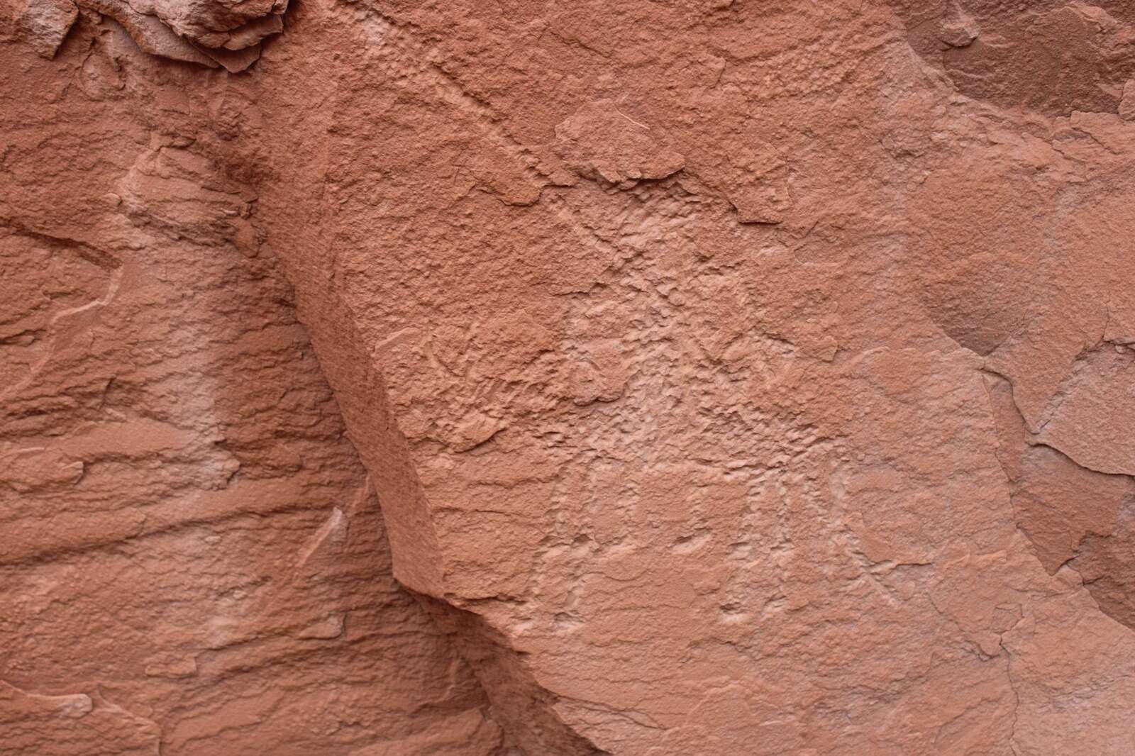 Many Anglo or Euro-American settlers carved their names and dates into stone as they traversed canyon country for the first time or brought in livestock. I’ve found numerous names and dates from the 1880s into the 1920s and also engraved horseheads, horses, steers and even a jolly pig with its curlicue tail. Pioneer cowboys and ranchers etched their initials and dates on trail switchbacks and where creeks and washes flow toward rivers. Earlier, Paiutes, Utes and Navajos observing Anglos pecked and incised on rock what they saw, including Spanish soldiers from the mid-1800s, a spectacular gunfight or shootout on the San Juan River, and later steam locomotives, trucks and cars.
