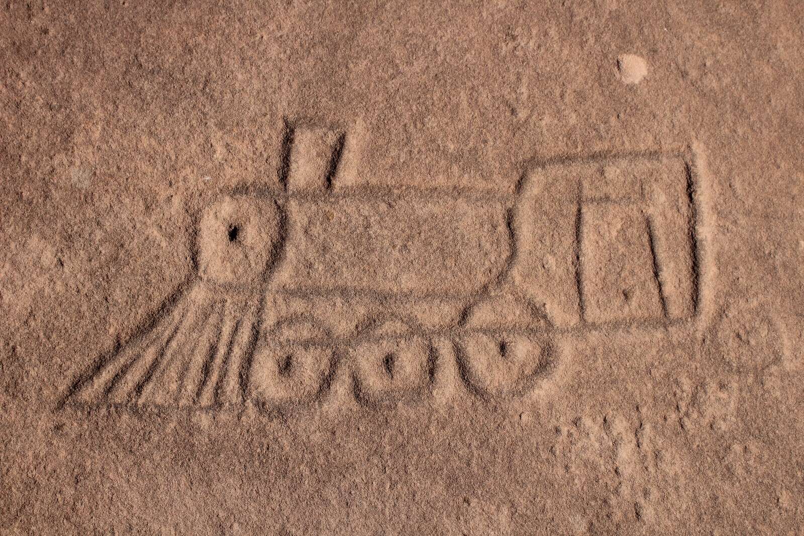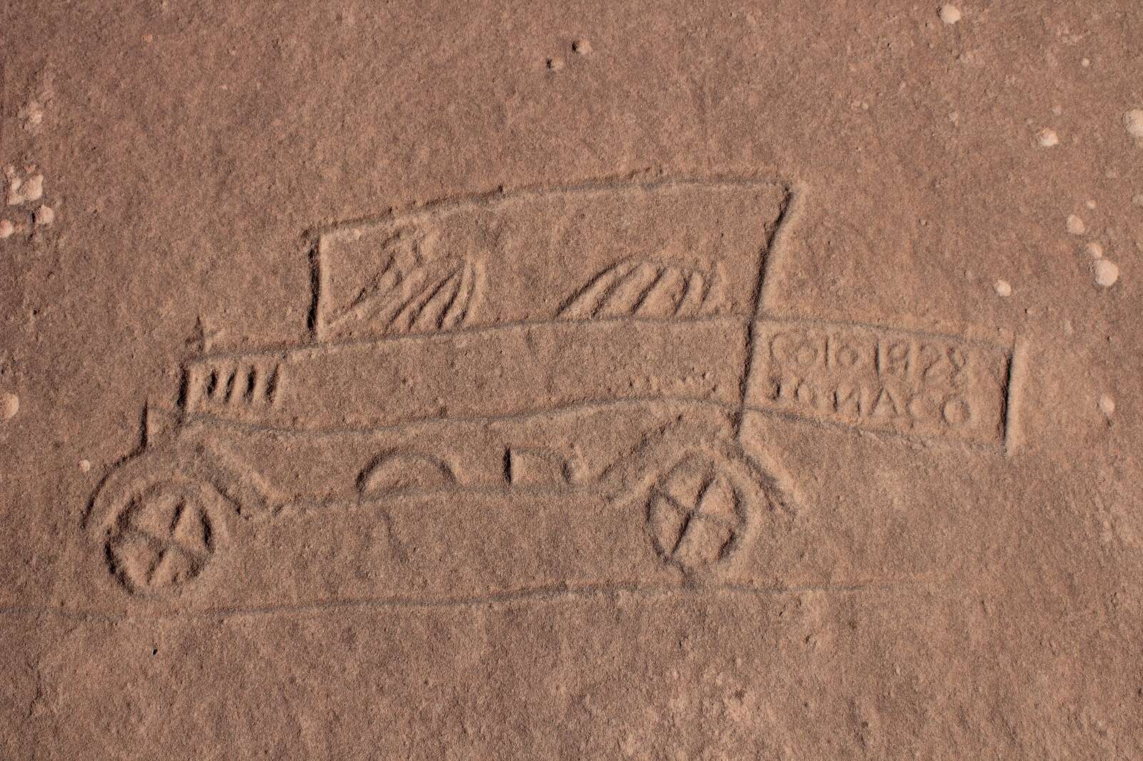 Equally compelling are scenes of machines carved into sandstone ledges beside creeks flowing into the San Juan. Off one shallow arroyo, I hit a gold mine of glyphs with a carefully etched steam locomotive, a large freight or dump truck, and a fun, soft-cloth, four-door touring car, probably a Ford, with fading words on the back that spelled out IGNACIO 1928. Perhaps the vehicle’s occupants were Southern Utes driving to visit relatives at White Mesa south of Blanding, Utah. In that decade, roads toward Bluff would have wound up and down through sandy washes and been a trial for any traveler. That explains the truck and car. Whoever carved the steam locomotive must have visited Dolores or Durango to see one.