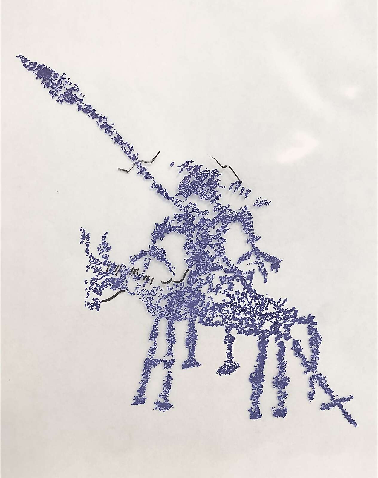 “He’s got to be a Spanish soldier, unless he’s a Comanche or cibolero,” said Spanish colonial historian John Kessell, who adds, “It’s curious that he doesn’t have one hand on the lance. Is that a sword on the ground behind the horse, and why? The glyph’s a first-class artifact (and mystery)!”