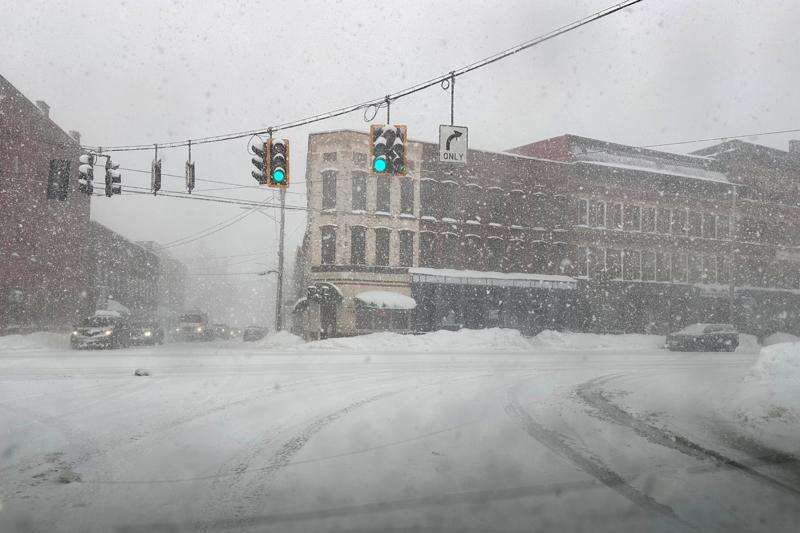 Fresh snow blows through an intersection in Lowville, N.Y., on Thursday, Jan. 22, 2026. (AP Photo/Cara Anna)
