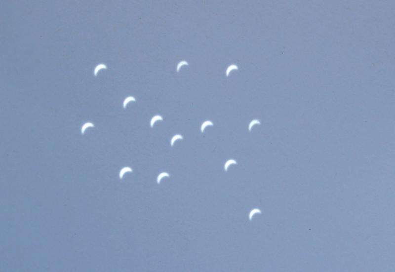 Shadows of the solar eclipse come are filtered through tree leaves on Monday in Dove Ranch.