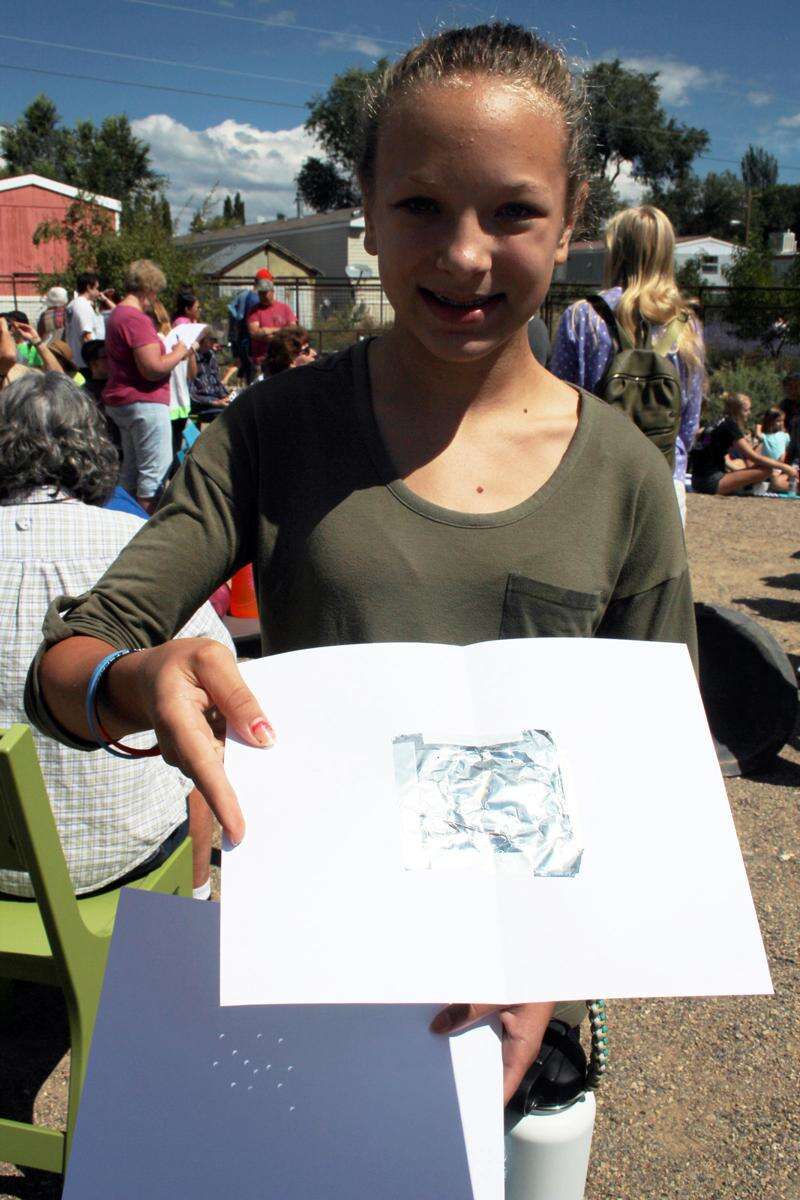 Nykole Meshew displays her pinhole viewer she made at the library's eclipse viewing party on Monday.