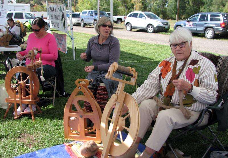 Amy Newton, left, Linda Smith and Joan Geiger spin yard on Saturday. They are members of the Los Pinos Fiber Alliance.