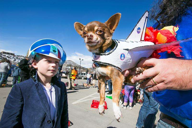 Eight-year-old Finley Cowham watches his dog, Ziggy, dressed as a space shuttle and held by his dad, Jacob Woham, before the start of the Snowdown Canine Fashion Show on Saturday held at McDonald’s.