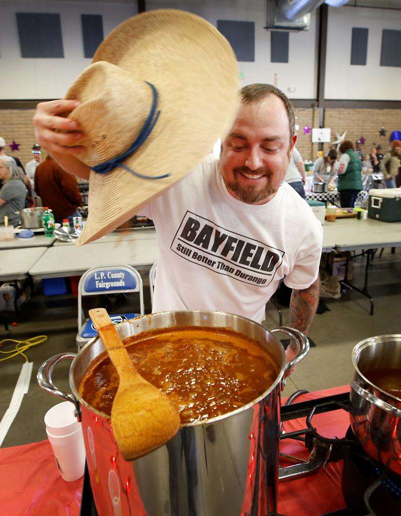 Henry Gonzales uses his hat to stir the aroma of his red chili made of local elk, beef, red wine and Guinness beer during the Snowdown 2017 Chili Cook-Off and Bloody Mary Contest on Saturday in the Exhibit Building at the La Plata County Fairgrounds. Check out more photos at durangoherald.com /Snowdown.
