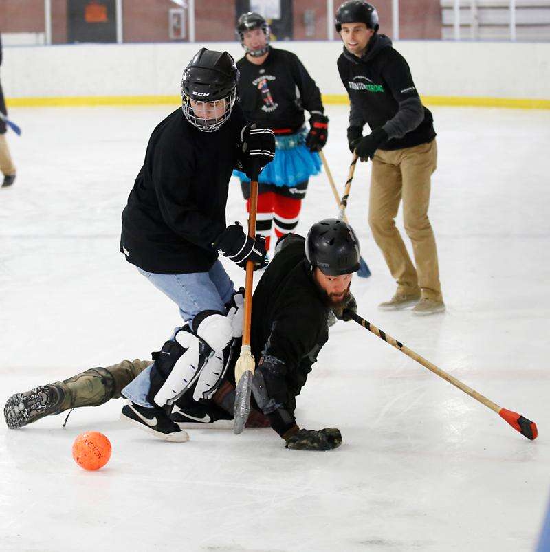 Stardust and Intergalactic Broom teams battle it out on Saturday during Snowdown 2017 Broomball Tournament at the Chapman Hill Ice Rink.