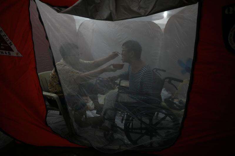 Judy Bertuso, left, feeds her husband Apollo inside a tent at an evacuation center as Typhoon Fung-wong enters the country on Sunday, Nov. 9, 2025 in Quezon city, Philippines. (AP Photo/Aaron Favila)