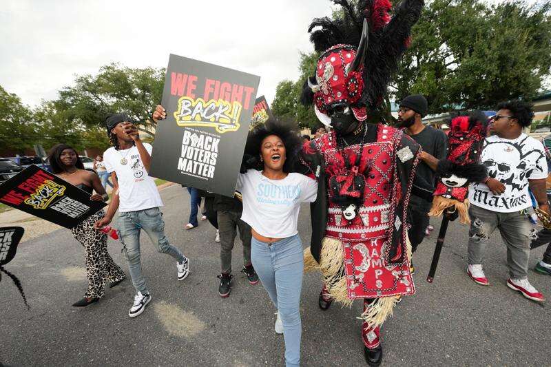 FILE - Students and a member of the Zulu Tramps march to a campus polling place on Election Day at Southern University in Baton Rouge, La., Nov. 5, 2024. (AP Photo/Gerald Herbert, File)