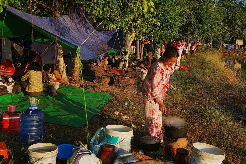 People prepare breakfast as they take refuge at Wat Chroy Neangoun's Buddhist pagoda in Siem Reap province, Cambodia Friday, Dec. 12, 2025, after fleeing from home following fighting between Thailand and Cambodia over territorial claims. (AP Photo/Heng Sinith)