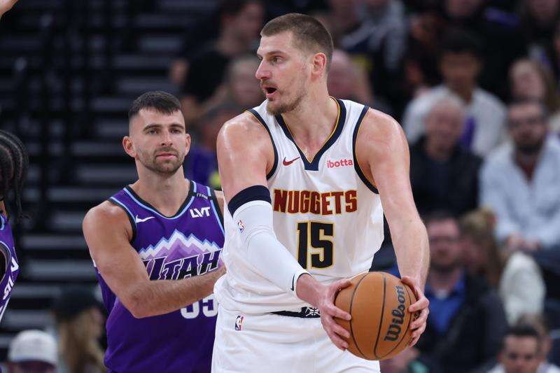 Denver Nuggets center Nikola Jokic (15) looks for a play against Utah Jazz guard John Konchar (55) during the first half of an NBA basketball game, Wednesday, April 1, 2026, in Salt Lake City. (AP Photo/Rob Gray)