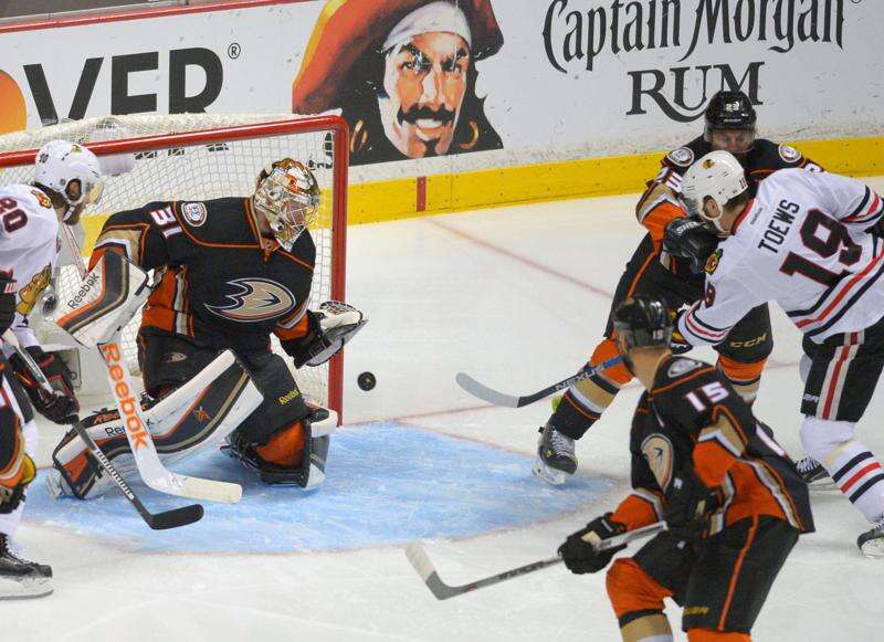 Anaheim immediately showed tension in its game, perhaps remembering their three-goal first period deficit in their Game 7 loss to the Los Angeles Kings last spring. After Jakob Silfverberg took a hooking penalty midway through the period, Toews capitalized with a high shot through traffic, getting it through Saad’s screen in front.