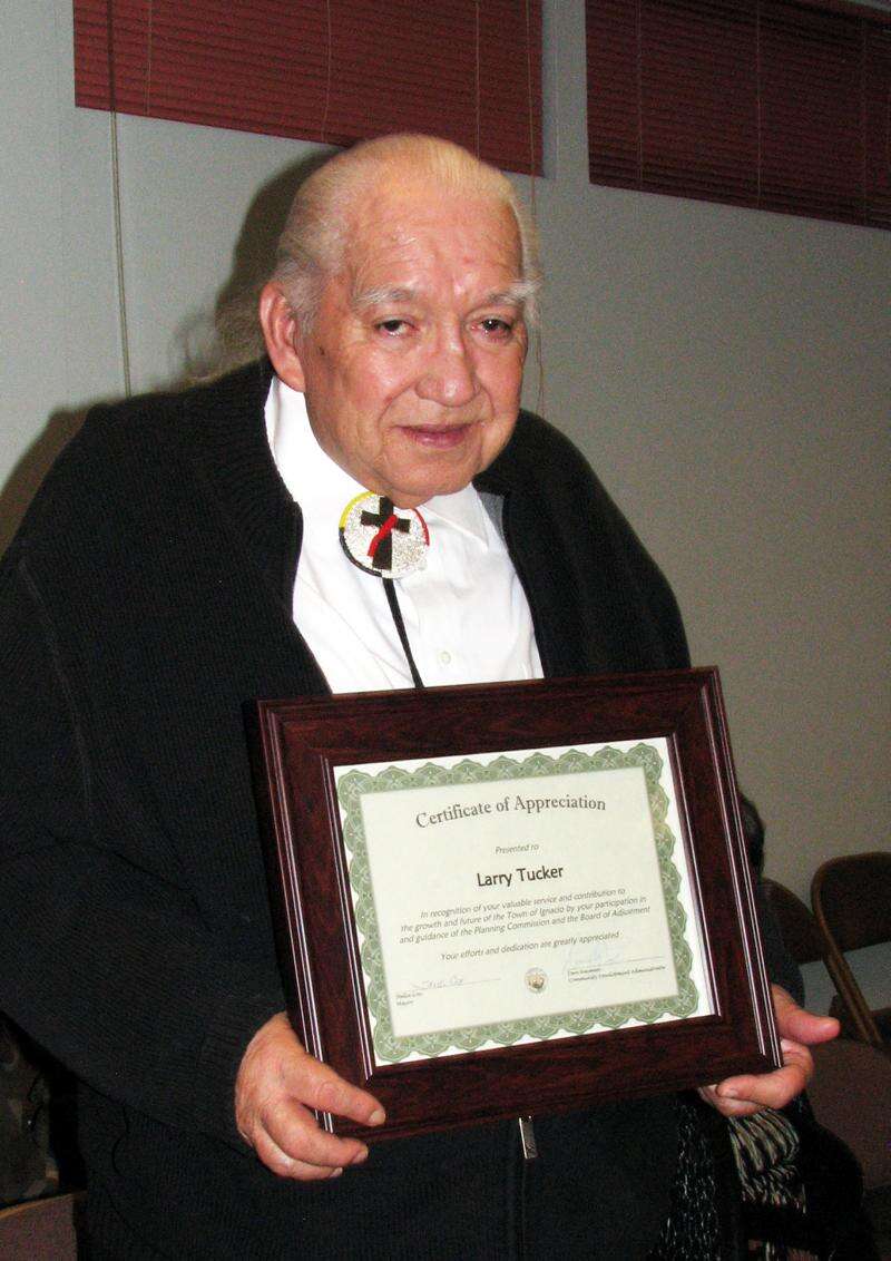 Ignacio town officials presented a thank you plaque to Larry Tucker at the March 15 town board meeting in recognition of his service on the town planning commission and board of adjustment. Tucker has retired from those positions. "I want to thank everybody for your support and love," he said.