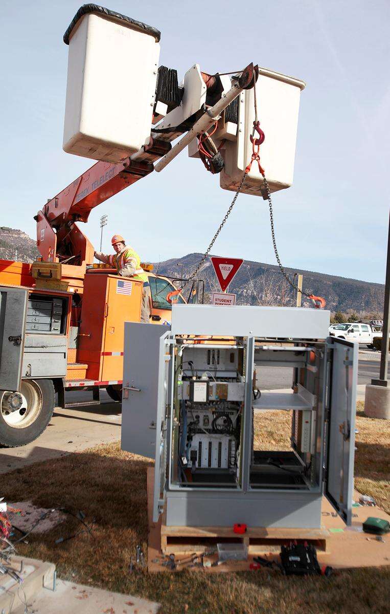 A Colorado Department of Transportation crew repaired a traffic signal control cabinet at Main Avenue and 25th Street on Monday after it was hit by a vehicle a day earlier.