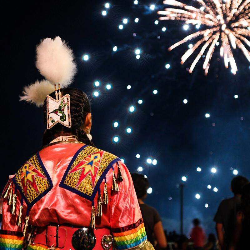 Powwow contestants take a break from dancing to enjoy the fireworks display at the Sky Ute Fairgrounds on Saturday.