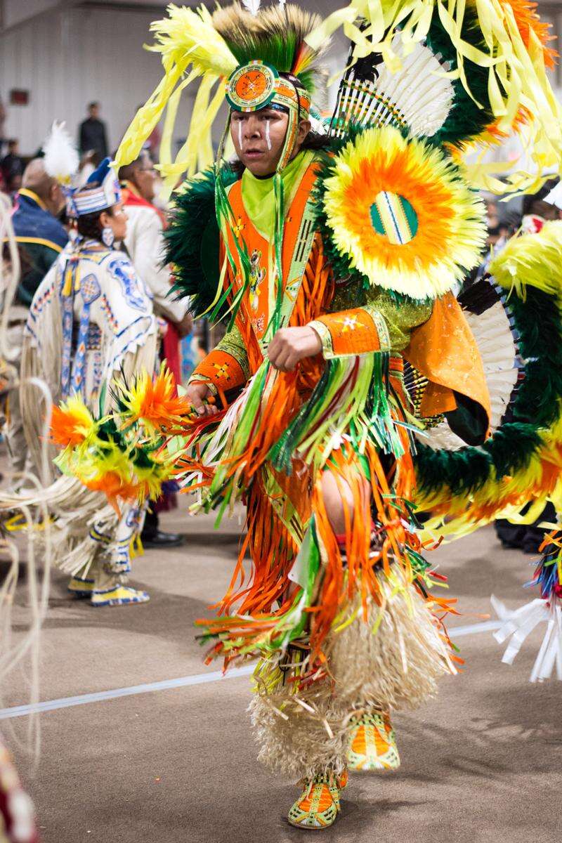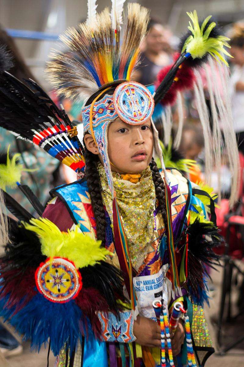 A young fancy dancer makes his way into the 98th annual Southern Ute Tribal Fair Contest Powwow that was hosted in the Sky Ute Fairgrounds arena on Saturday, Sept. 8.
