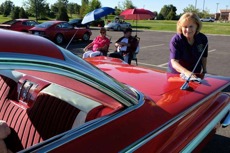 As classic cars fill the Sky Ute Casino Resort parking lot Saturday morning for their annual car show, Middy Atwood of Aztec adds a touch of shine to her Chevy Impala.