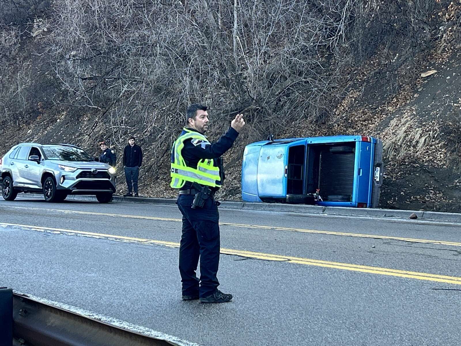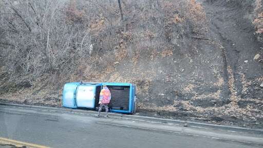 A blue Ford Ranger pickup truck flipped onto its side Thursday morning on Florida Road between Chapman Hill and the Florida Road-East Third Avenue intersection. (Christian Burney, Durango Herald)