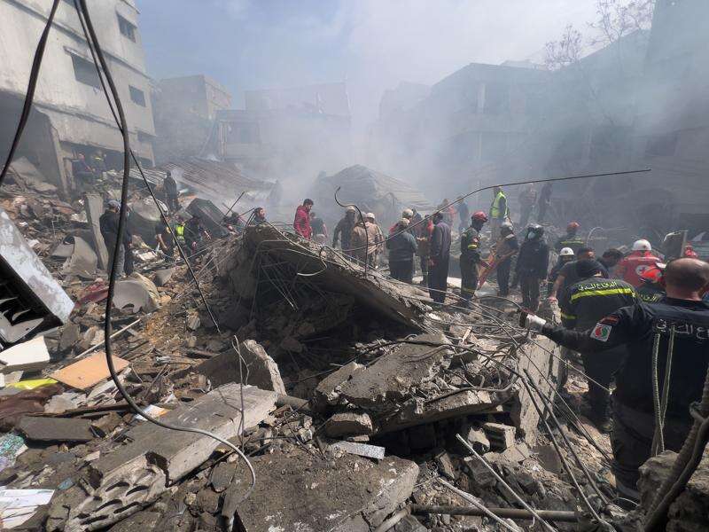 Rescue workers search for victims at the site of an Israeli airstrike that hit a crowded neighbourhood south of Beirut, Lebanon, Sunday, April 5, 2026. (AP Photo/Hussein Malla)