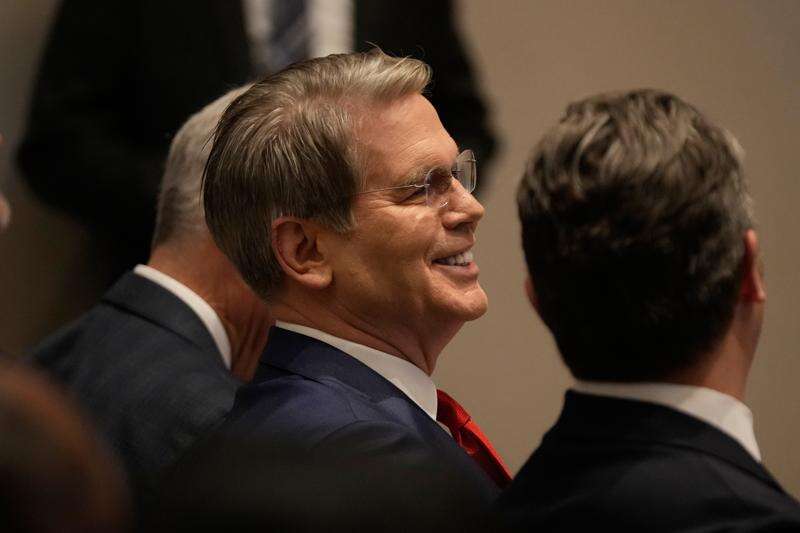Treasury Secretary Scott Bessent, left, sits next to Defense Secretary Pete Hegseth as President Donald Trump speaks at the Shield of the Americas Summit, Saturday, March 7, 2026, at Trump National Doral Miami in Doral, Fla.(AP Photo/Mark Schiefelbein)