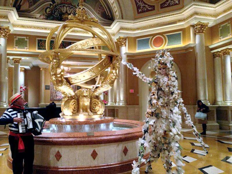 Beautifully costumed actors stroll around the casino halls, greeting children and posing for silly photos with adults. Outside, a 65-foot Christmas tree made of lights shines like a beacon, tempting pedestrians to come inside.