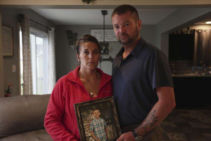Ashlee and Erik Dahlberg hold a photo of their late son, Liam, in their home in Lowell, Ind., on Tuesday, Aug. 12, 2025. (AP Photo/Laura Bargfeld)