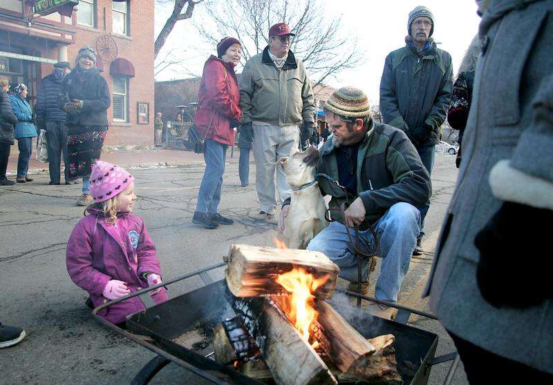 Marking the official start to winter, 5-year-old Sonya Tocco, daughter of Paul Tocco, warms her hands next to one of many bonfires Saturday evening on East Second Avenue. Joining her are Scott Baker and his dog Shelby. Merchants between Seventh and Eighth streets participated in the second annual “Welcome Back the Light & Celebrate a Scandinavian Winter Solstice” event. Other activities included tarot readings and live music.