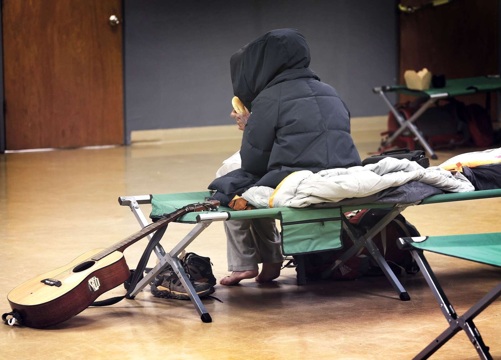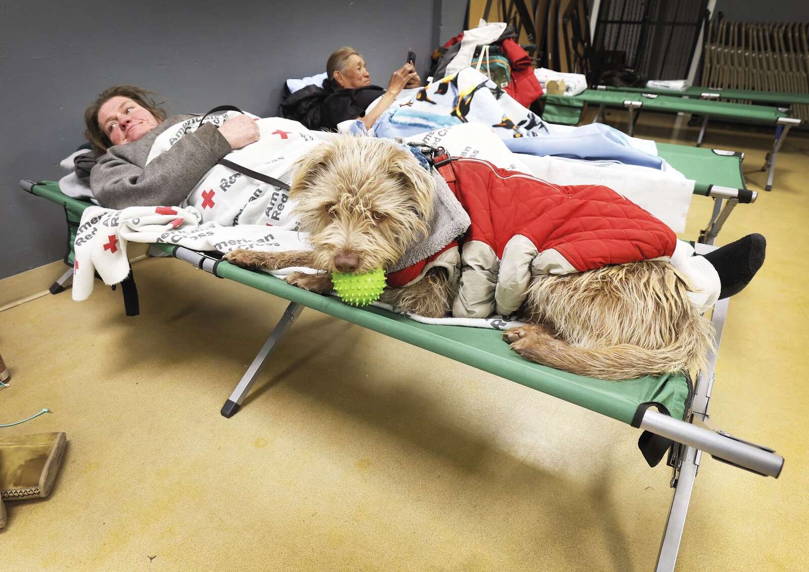 This center is a huge improvement, said Genevieve King and Rosalee, who declined to give her last name. They’re snuggled in cots pushed against the back wall. Rosalee’s dog sits at her feet gnawing on a disintegrating rubber ball that does not seem long for this world.