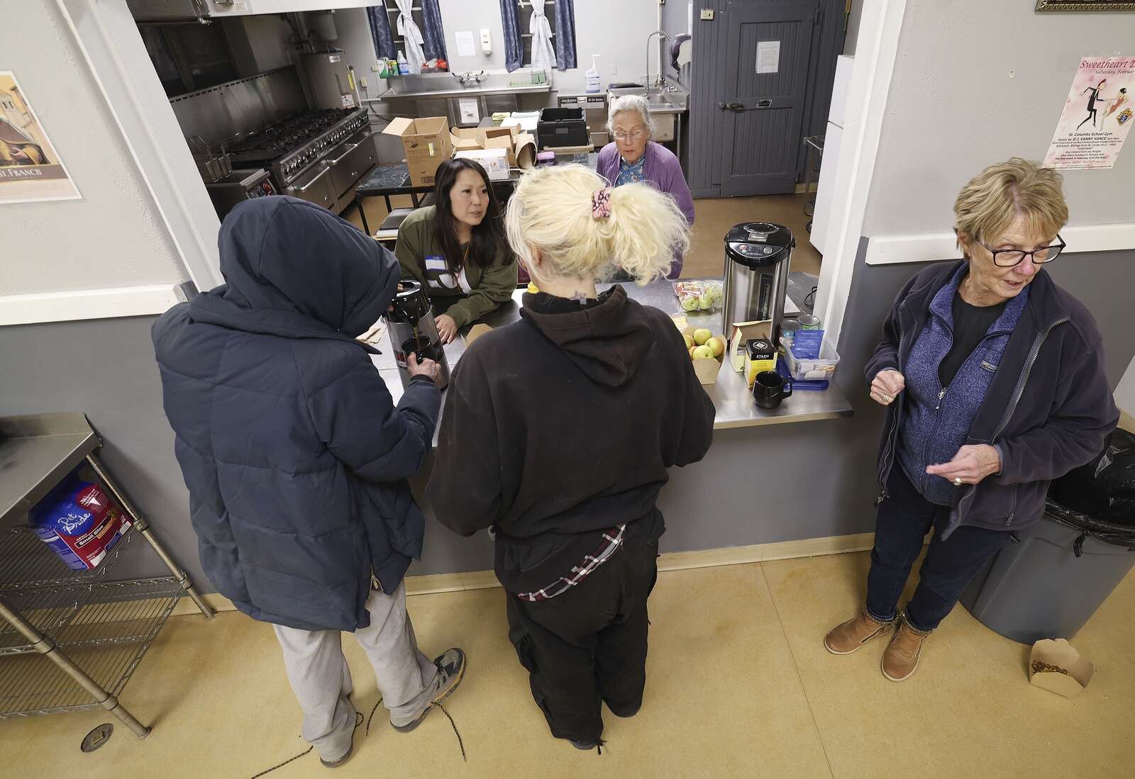 It’s busier than the night before. About a dozen people are eating, chatting and winding down, which a volunteer attributed to the falling temperatures and word-of-mouth.