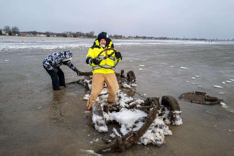 Kevin Aldrich, 33, a maintenance worker from Monroe, Michigan, said he has never seen the lake recede so much and was surprised Monday to spot remnants of piers dating back to the 1830s. He posted photos on social media of wooden pilings sticking up several feet from the muck.