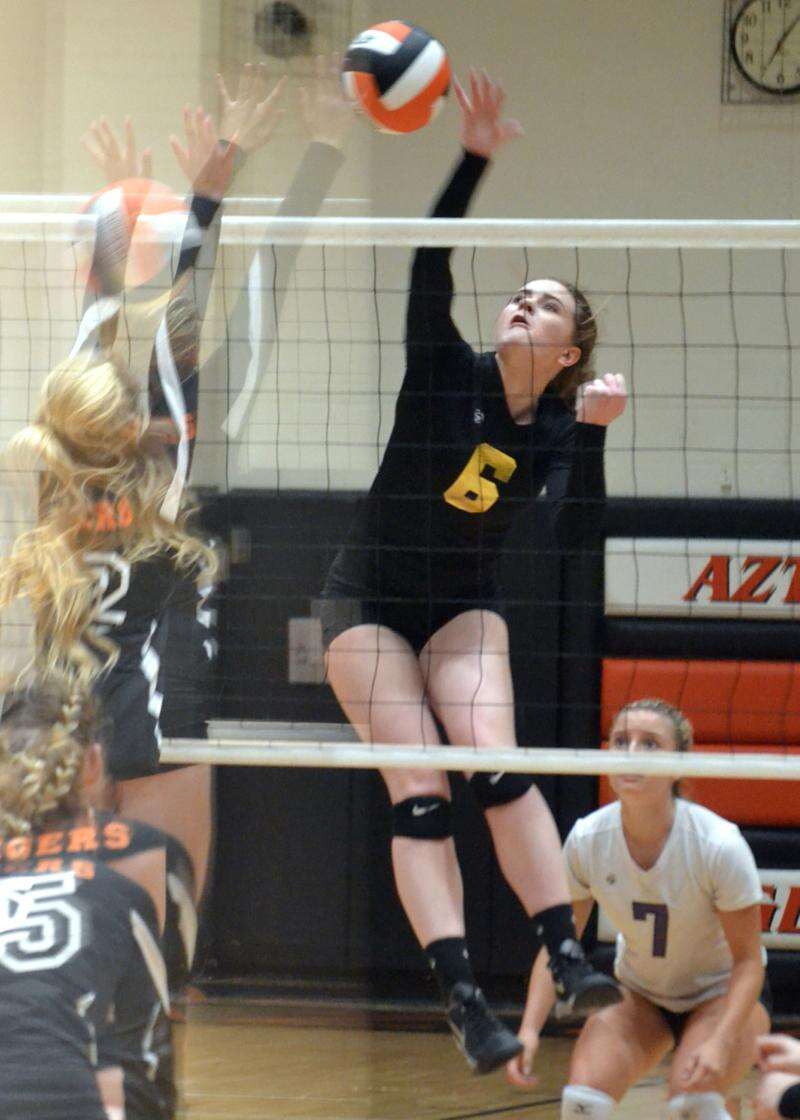 Game 2 began with Aztec's Reigan Weaver netting an attack, putting Gabbard on serve for a four-point run. Weaver then blocked Mottin, but Bayles scored dumping a set and then aced both libero Liz Cox and Savannah McCarthy. Going for a third straight, she netted her serve, but after AHS' Felicia Urias did likewise, Mottin zipped one and Strauss paused play with the Tigers (3-4, 0-0 NMAA Dist. 1-5A) down 10-3.